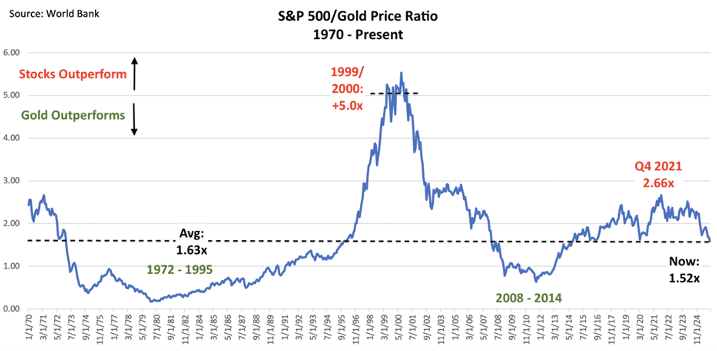 The chart below reflects the price ratio between gold and the S&P 500. When the ratio is falling, gold is outperforming the index, and when it is rising gold is underperforming. Today, it falls right on its long-term average, which suggests that for gold to continue outperforming the index we would likely need to see concerns about excessive stock valuations or global financial instability, as we did during the Great Financial Crisis or the hyper inflation of the early 1980s. That is not my outlook for the year ahead. Therefore, while precious metals should continue to serve as a valuable hedge in portfolios, their outside price appreciation is unlikely to continue.