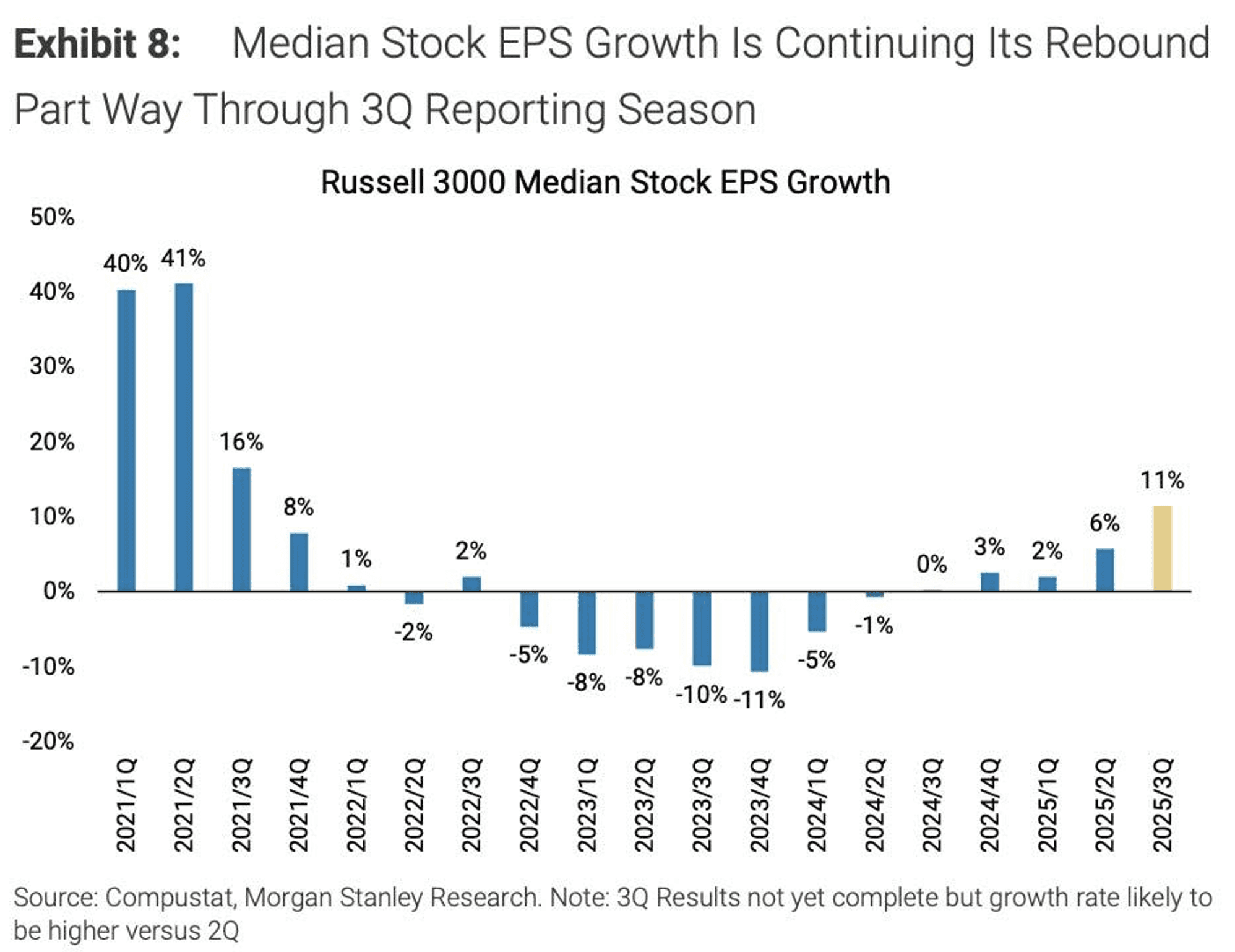 Stock price performance tends to track very closely with earnings growth over time. Since the introduction of ChatGPT in late 2022, earnings for the S&P 500 have grown approximately 27% on a cumulative basis, fueled largely by the AI investment buildout. Earnings for small cap stocks have been virtually flat. That equation started to change late last year, as the rate of earnings growth for the Nasdaq 100, led by the Magnificent 7, decelerated from its rampant pace in 2024 (+36.8%) to 2025 (18% expected). Meanwhile, earnings growth was accelerating for the rest of the market. As a precursor to the outperformance I expected from the average stock last November, led by small caps, I shared the chart below. It shows the significant increase in earnings growth expected for the median stock in the third quarter of last year, which is continuing into the fourth.