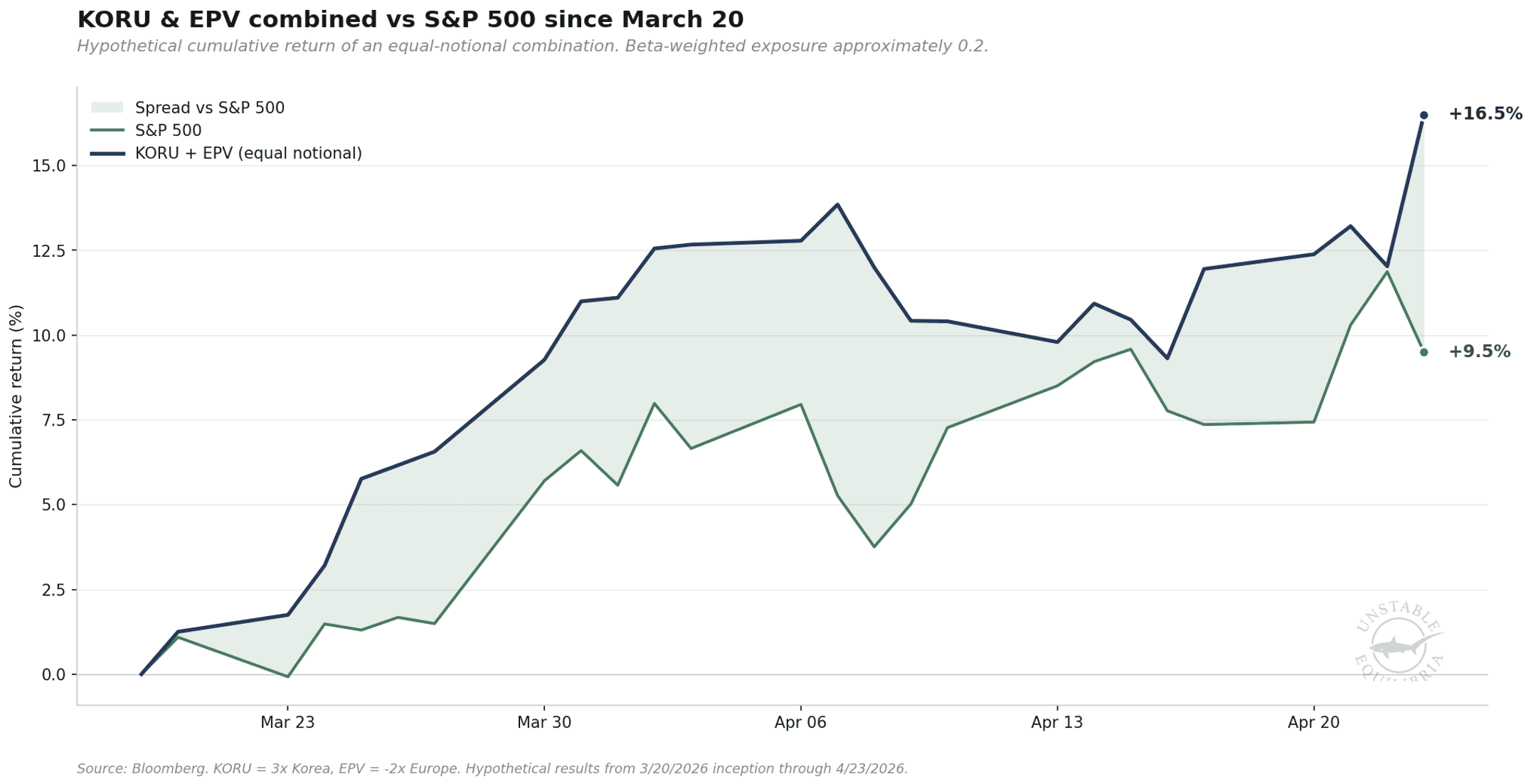 From the March 20 inception date, with the components held at equal notional weight, the combined hypothetical position would have moved roughly 16.5% over 23 trading days, approximately 7 percentage points above the S&P 500 over the same window, at beta-weighted exposure of about 0.2. Most of the move came from the long leg. KORU appreciated materially since inception; EPV declined only modestly because European equities rallied with the broader risk-on. The thesis has not yet expressed itself fully through the mechanism originally framed, and that distinction matters. The a priori expected return on the framework was 22.2%.
