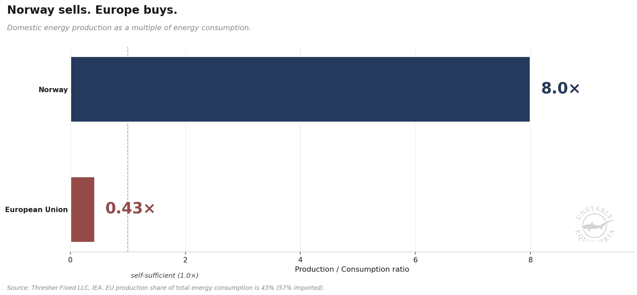 Norway produces nearly eight times the energy it consumes, runs its domestic economy on hydropower, sits on a $1.9 trillion sovereign wealth fund, and runs a 4% policy rate that Norges Bank has signaled will go higher. It exports gas to Germany, missiles to Poland (Kongsberg's Q4 defence book-to-bill ran 2.84, with a January Polish counter-UAS contract that was the largest in the company's history), salmon to Spain, and fertilizer to most of the continent. Every barrel and cubic metre Norway exports is priced in dollars or euros, earned in kroner, and substitutes for almost nothing domestic. Every barrel and cubic metre Europe imports is a transfer out of household budgets, industrial margins, and trade balances.